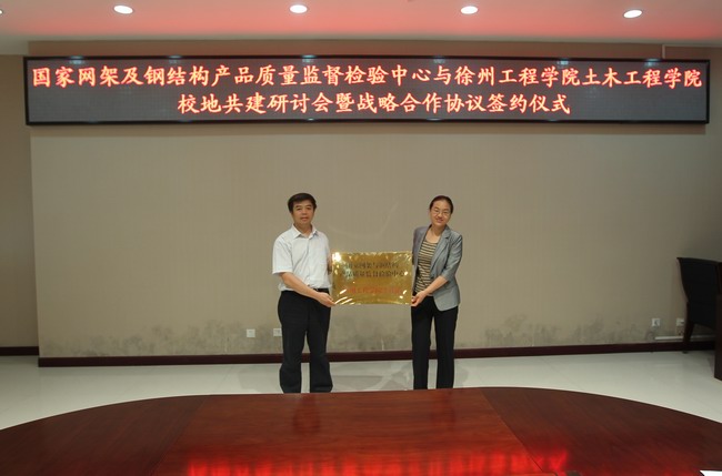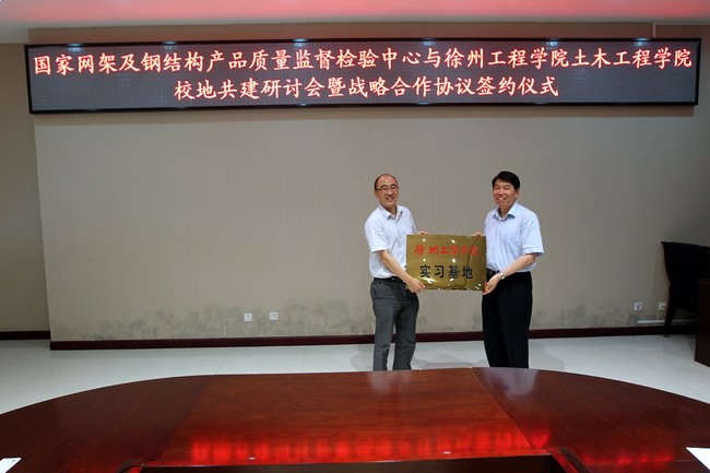 永利yl23411集团官网姜慧书记与中心谢东主任代表双方签署《永利yl23411集团官网与国家网架及钢结构产品质量监督检验中心校企建研讨会暨战略合作协议》。签字仪式后,举行了“学院实习基地” 、“国家网架及钢结构产品质量监督检验中心学院工作站” 授牌仪式。