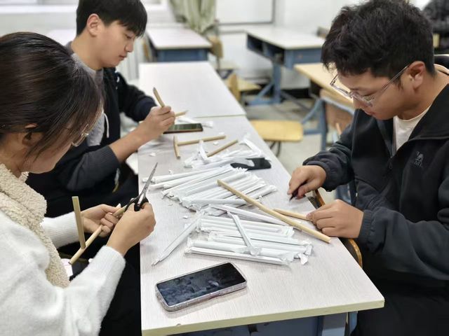 各参赛队伍在领取材料后迅速投入创作。同学们巧妙运用槽口榫、双榫、双夹榫等传统连接方式,将一根根普通吸管转化为稳固而立体的空间结构。裁剪、插接、加固……每一处节点的精心处理,都展现出同学们对力学原理的理解与对细节的专注。现场既有紧张的搭建节奏,也有团队间默契的配合与交流。加载测评环节,各组依次展示作品并讲解其中运用的榫卯结构。有的作品以高度取胜,挺拔而立;有的以复杂的节点设计见长,结构精巧。评委根据完成时间、独立稳定性、实测高度及结构种类进行综合打分,确保比赛结果公平公正。经过激烈角逐与严格评审,最终张宇、刘勤海、王翼博、胡俣航、孟雅、姜佩琪荣获一等奖,王思颖、丁可馨、陈科旭、刘翔、陈治名、陆贵飚、刘灏烨、董家豪荣获二等奖,李梓源、戴博文、张嘉豪、祝民康、戴寒宵、南嘉驰、吴苏茜、王礼勇、赵艺涵、韩驰、吴浩鑫、朱家伟荣获三等奖。获奖团队凭借创新的结构设计、稳定的实体表现与清晰的原理阐述赢得一致好评。