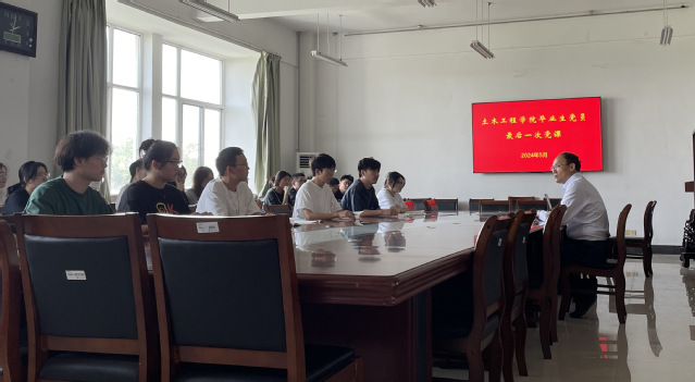 刘书记首先代表学院向即将完成学业的毕业生党员表示热烈的祝贺及美好的祝愿。他强调新时代大学生作为国家建设的主力军,一定要系好人生中的“价值纽扣”,加强自身的廉洁教育。接着刘书记带领全体毕业生党员逐字逐句学习《中国共产党纪律处分条例》,并强调所有毕业生在工作中要坚持把纪律挺在前面,坚定理想信念,守住底线、坚守红线,自觉反腐倡廉,做到警钟长鸣。刘书记也对所有毕业生党员做出四点嘱托,第一点希望毕业生党员们在毕业后的职业生涯工作中能够继续保持优秀,不论在继续的学习深造,还是工作岗位上都要充满干劲,继续前进,为我国的建筑业发展做出贡献;第二点鼓励毕业生党员要牢记习近平总书记的嘱托,树立远大的人生理想,谨记党员身份,不忘初心,牢记使命;第三点希望同学们能够在毕业后常回母校,与老师多进行交流,为学弟学妹们多分享经验;第四点即倡导毕业生党员充分发挥党员先锋模范作用,带动室友、班级同学、周围朋友在离校之际文明离校。