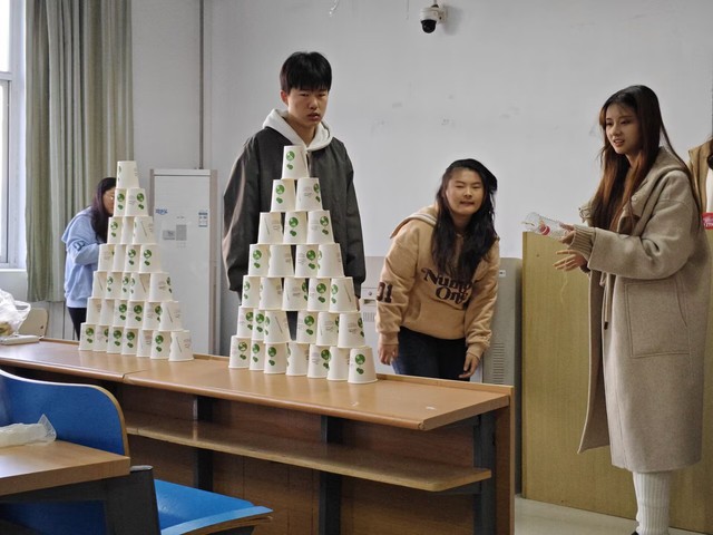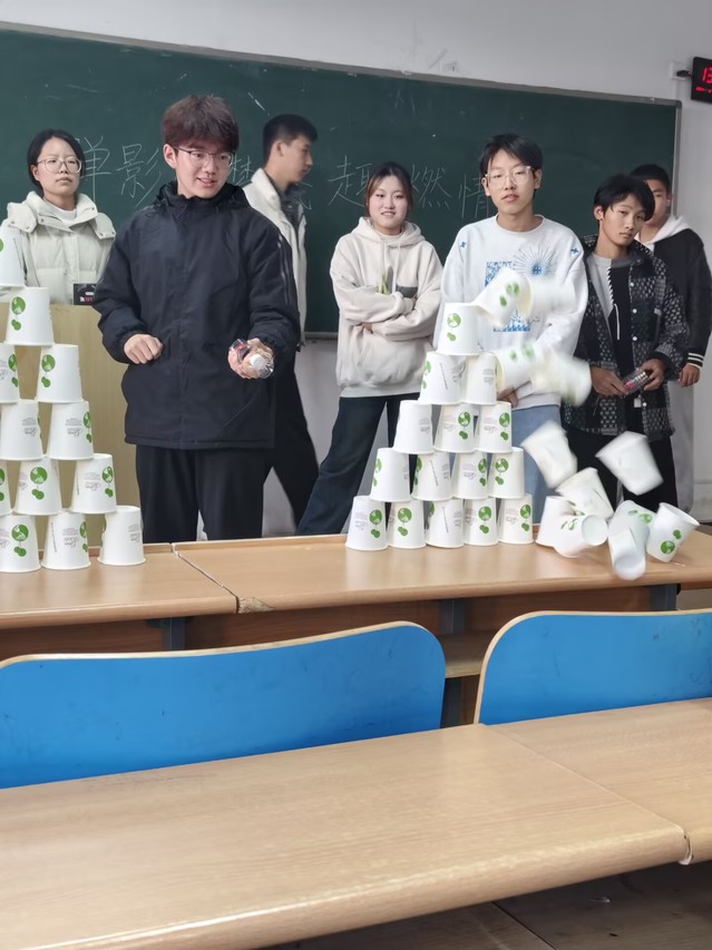 本次活动学生们分为2人一组,利用2个塑料瓶、2根橡皮筋、1把剪刀、1卷胶带、1根细绳,制作出一个弹射装置。同学们发挥奇思妙想,努力使自己的作品更牢固,更利于精准发射。他们不仅要考虑到弹射装置的结构稳定性,还要考虑如何利用有限的材料实现最大的弹射力和精准度。在这个过程中,学生们的团队合作能力、创新思维和动手能力都得到了极大的锻炼和提升。随着时间的推移,各个小组将自己的弹射装置带到指定地点进行成绩测量。测量时需使用乒乓球作为子弹,对纸杯塔进行射击,由科协工作人员进行成绩的测量和登记。根据两次击落的纸杯累加数量,科协评选出了一、二、三等奖。最终24地下张文博,24地下李建宁凭借射击何处可击倒更多纸杯的分析能力及精准的弹射技术,荣获一等奖。