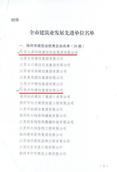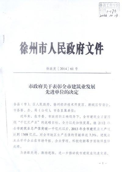 日前,徐州市政府对全市建筑业发展做出突出贡献的20家优秀企业和3家龙头企业进行了表彰。我院校友王凯创办的江苏九鼎环球建设科技集团有限公司、张清创办的江苏中阳建设集团有限公司同时被授予徐州市建筑业优秀企业和徐州市建筑业龙头企业的荣誉称号。